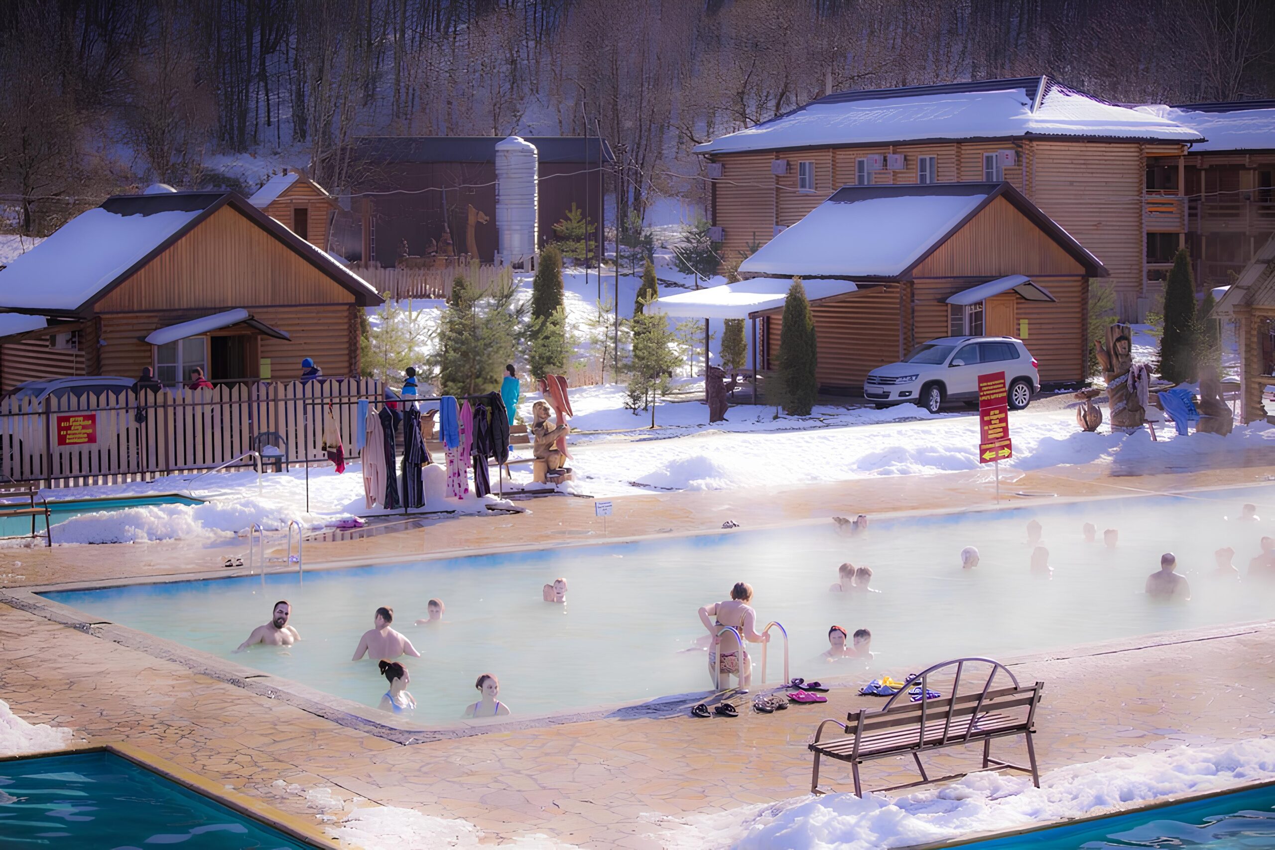 - Открытые термальные чаши: как правило, несколько зон для взрослых и детей; зимой поверхность вокруг обогревается или регулярно очищается.
